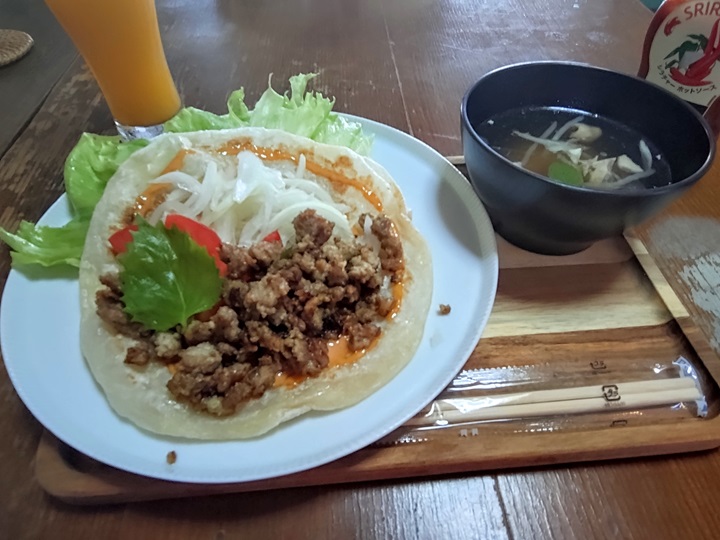 今回の「ラジぽてセット」はオープンタコス(500円)。スープもついており、このお値段ではなかなかランチを食べられないご時世ですのでありがたい限りです。シラチャーソースをお好みでかけて、辛さも調節できます。